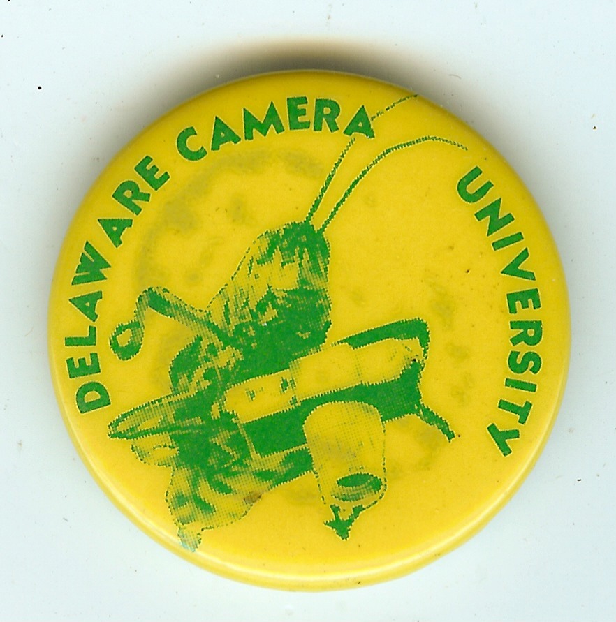 Pinbcack button for "Delaware Camera University" possibly linked to the idea of a "Shutterbug"