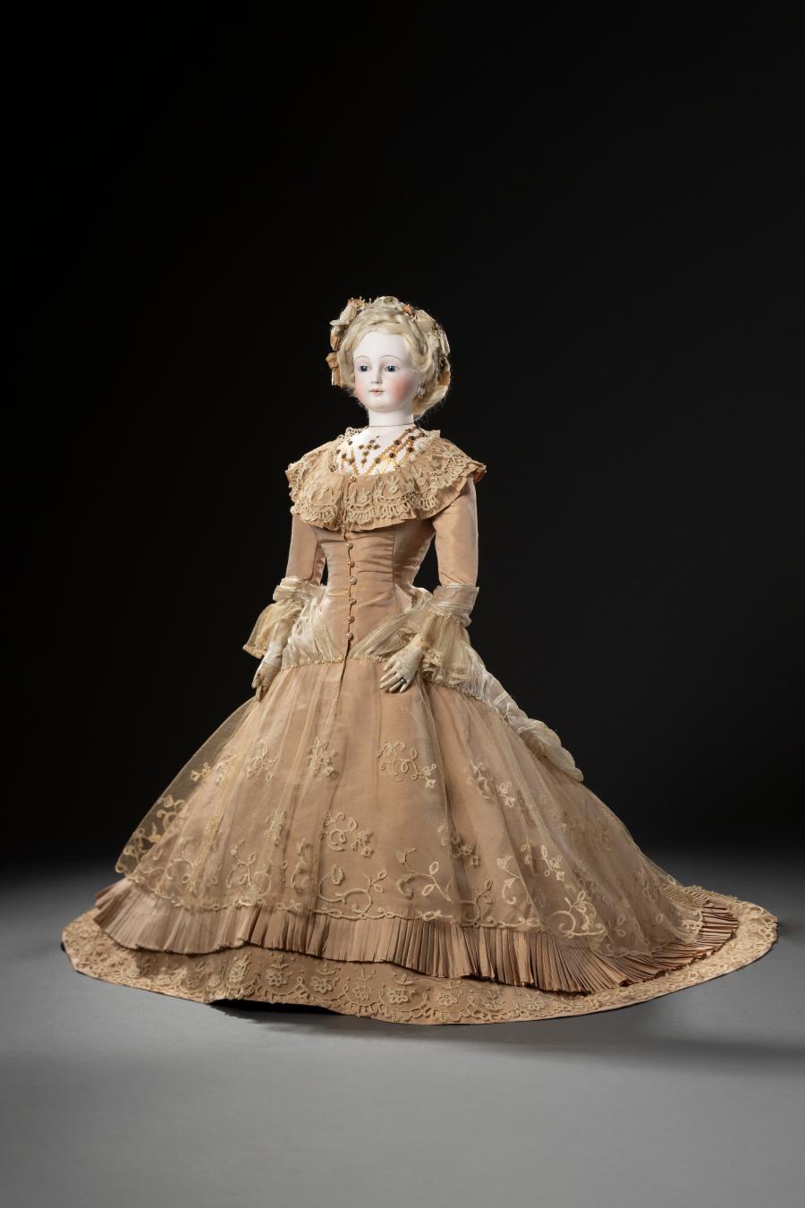 Doll, bisque porcelain, glass, human hair (head), kid leather (body), silk, cotton, paint, metal-mounted microphotographs