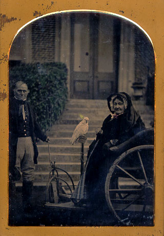 Portrait of an older lady in some sort of handcart conveyance, pulled by her man servant. On the front of the cart on a perch sits her Parrot or Macaw. (English)