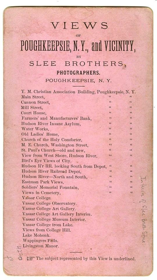 Backlist for "Views of Poughkeepsie, N.Y., and Vicinity, by Slee Brothers, Photographers, Poughkeepsie, N.Y."