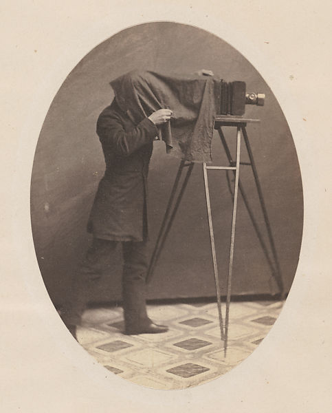 In this evocative image, picture making takes center stage. Underneath a canopy of dark cloth, the photographer poses as if to adjust the bellows of a large-format camera. The view reflected on its ground glass would appear reversed and upside down. Viewers' expectations are similarly overturned, because the photographer's subject remains unseen.