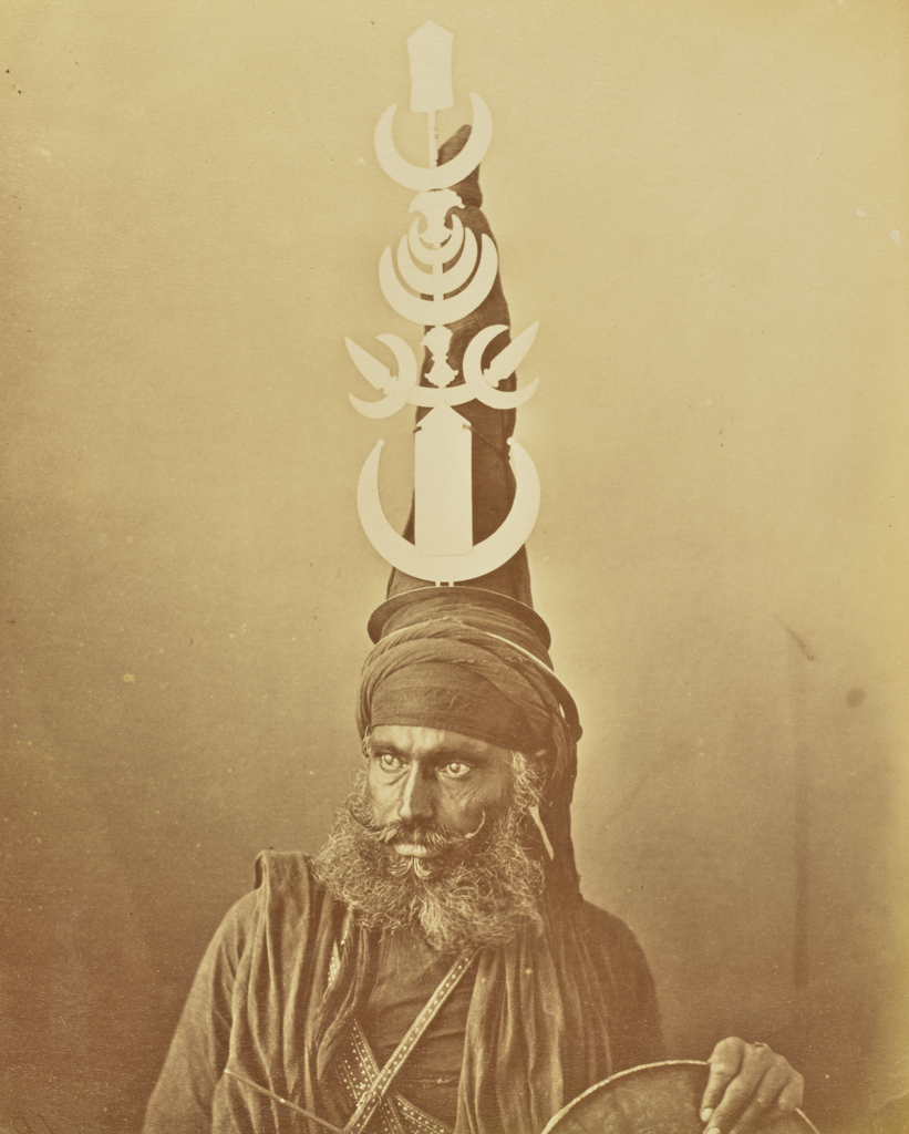 Portrait of a Sikh warrior, also known as Nihang or Akali, wearing an elaborate conical turban, adorned with chakrams or war-quoits.