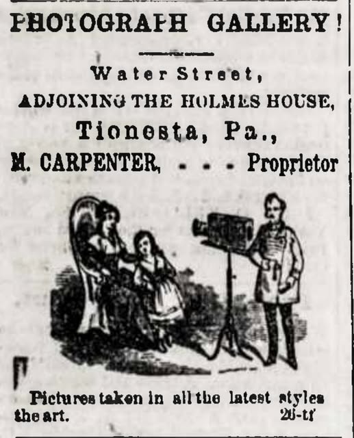 Newspaper advertisement for "Photograph Gallery! - Water Street, Adjoining the Holmes House, Tionesta, Pa., M. Carpenter… Proprieter"