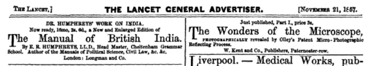 Advert for "Just published, Part I, price 3s, The wonders of the microscope photographically revealed, by means of Olley's patent micro-photographic reflecting process. W. Kent and Co., Publishers, Paternoster-row."