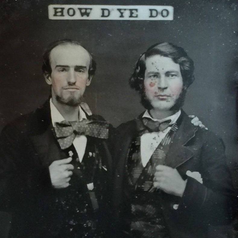 Two men with a sign "How D'Ye Do" behind them