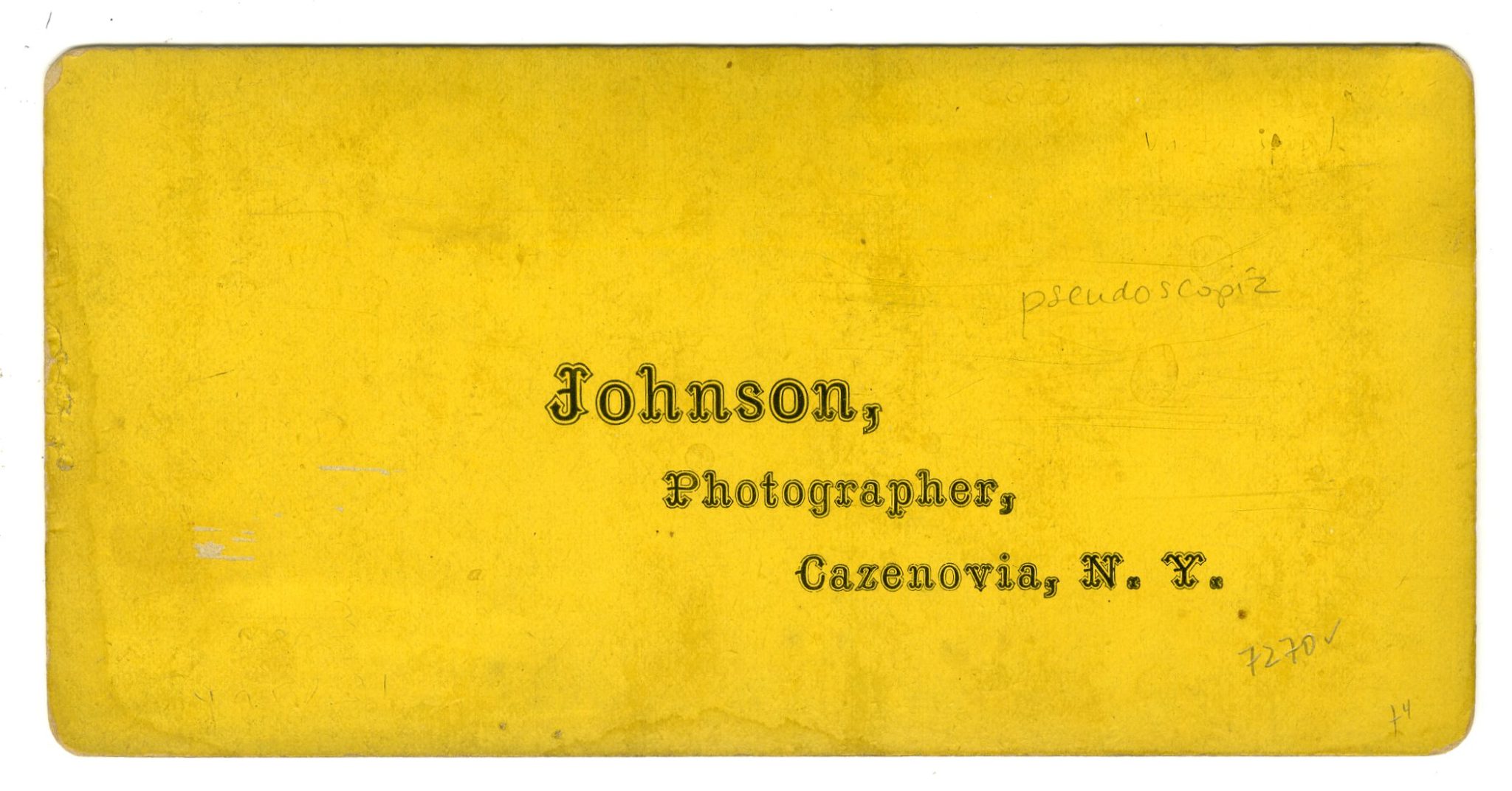 Stereocard, back Jeffrey Kraus Collection (Alan Griffiths, 19 March 2021) There were two stereo photographers with the surname Johnson in Cazenovia, NY - A.A. and D.J. - which one is this?