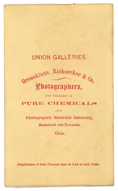 Backmark for "Union Galleries. Grossklaus, Ricksecker & Co. Photographers and Dealers in Pure Chemicals and Photographic Materials Generally, Massillon and Navarre, Ohio."