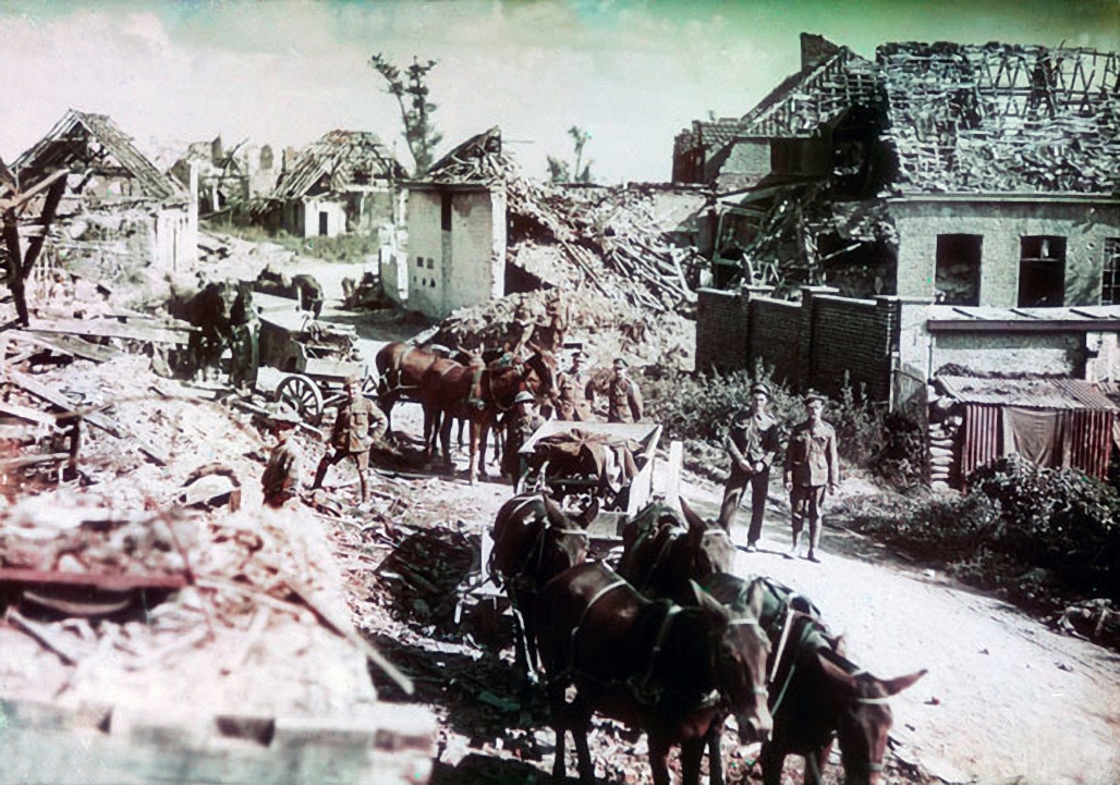 Soldiers, mules and carts in the ruined village of Voormezeele South of Ypres on the Western Front, World War I. Belgium,