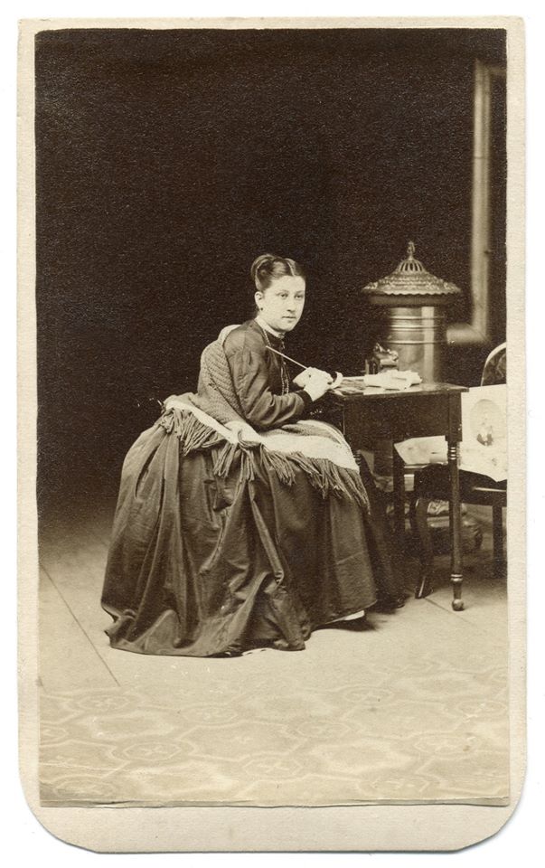 Carte de visite Private collection of Ron Coddington A woman wrapped in a shawl sits with brush in hand. On the desk in front of her is scattered unmounted albumen prints—one of which she is tinting. Examples of her work are propped up on a nearby chair. In the background is a stove, perhaps to dry the damp cartes de visite or to keep her warm.