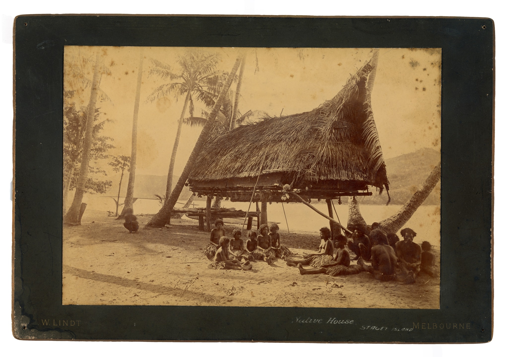 Plate 39 Group and Native House, Mairy Pass, Mainland of New Guinea in the Distance