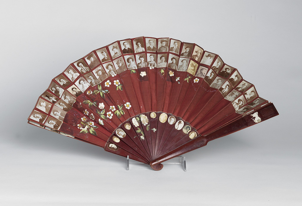 1890s Hand-painted, red lacquer and linen fan with 65 photographs that are neatly arranged in two rows at the top and smaller oval-shaped portraits at the handle. Printing-out paper prints