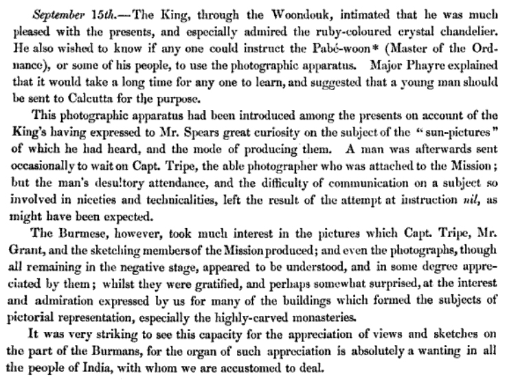The Burmese, however, took much interest in the pictures which Capt. Tripe, Mr. Grant, and the sketching members of the Mission produced; and even the photographs, though all remaining in the negative stage, appeared to be understood, and in some degree appreciated by them; whilst they were gratified, and perhaps somewhat surprised, at the interest and admiration expressed by us for many of the buildings which formed the subjects of pictorial representation, especially the highly-carved monasteries.