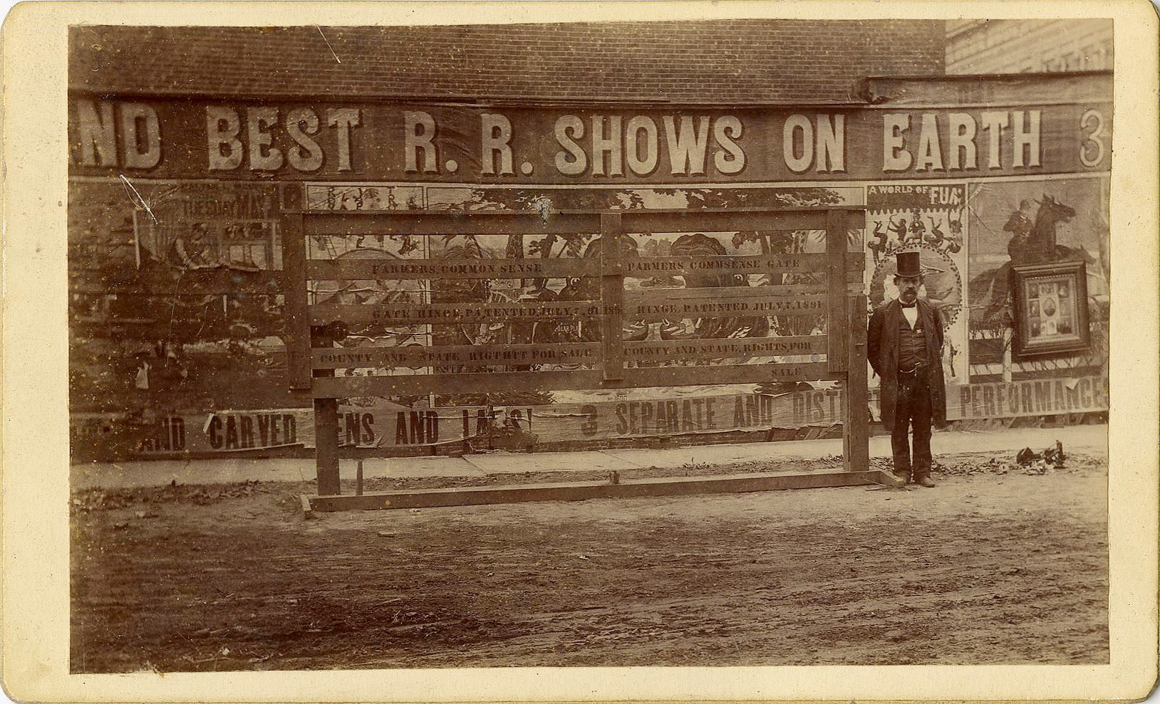 A photographer's display, circus posters, and a man wearing a top hat standing beside a gate patent model