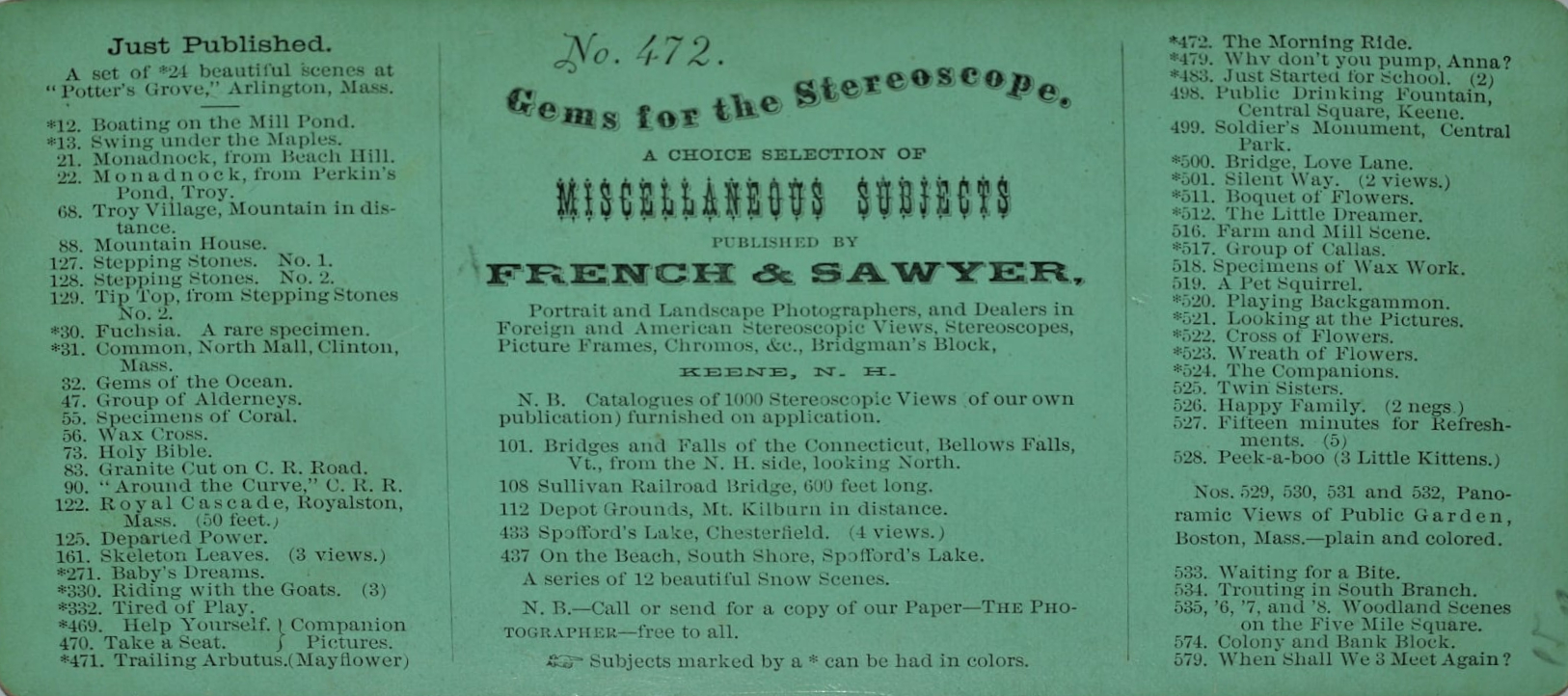 Backlist for "No. 475 Gems for the Stereoscope. A Choice Selection of Miscellaneous Subjects Published by French & Sawyer."