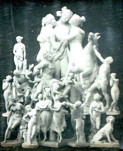 The plaster sculptures were part of the photo studio of Claude-Marie Ferrier who made stereo daguerreotypes for the Parisian optician Louis-Jules Duboscq, probably 1850-52. Ferrier photographed the sculptures separately as well. By 1852 he is making glass stereoviews for Duboscq.