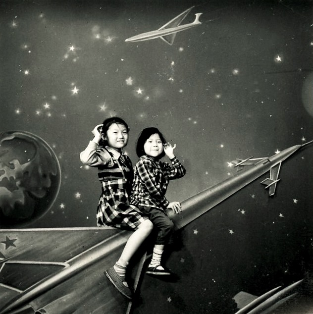Two children with a Space Age foreground and background, China