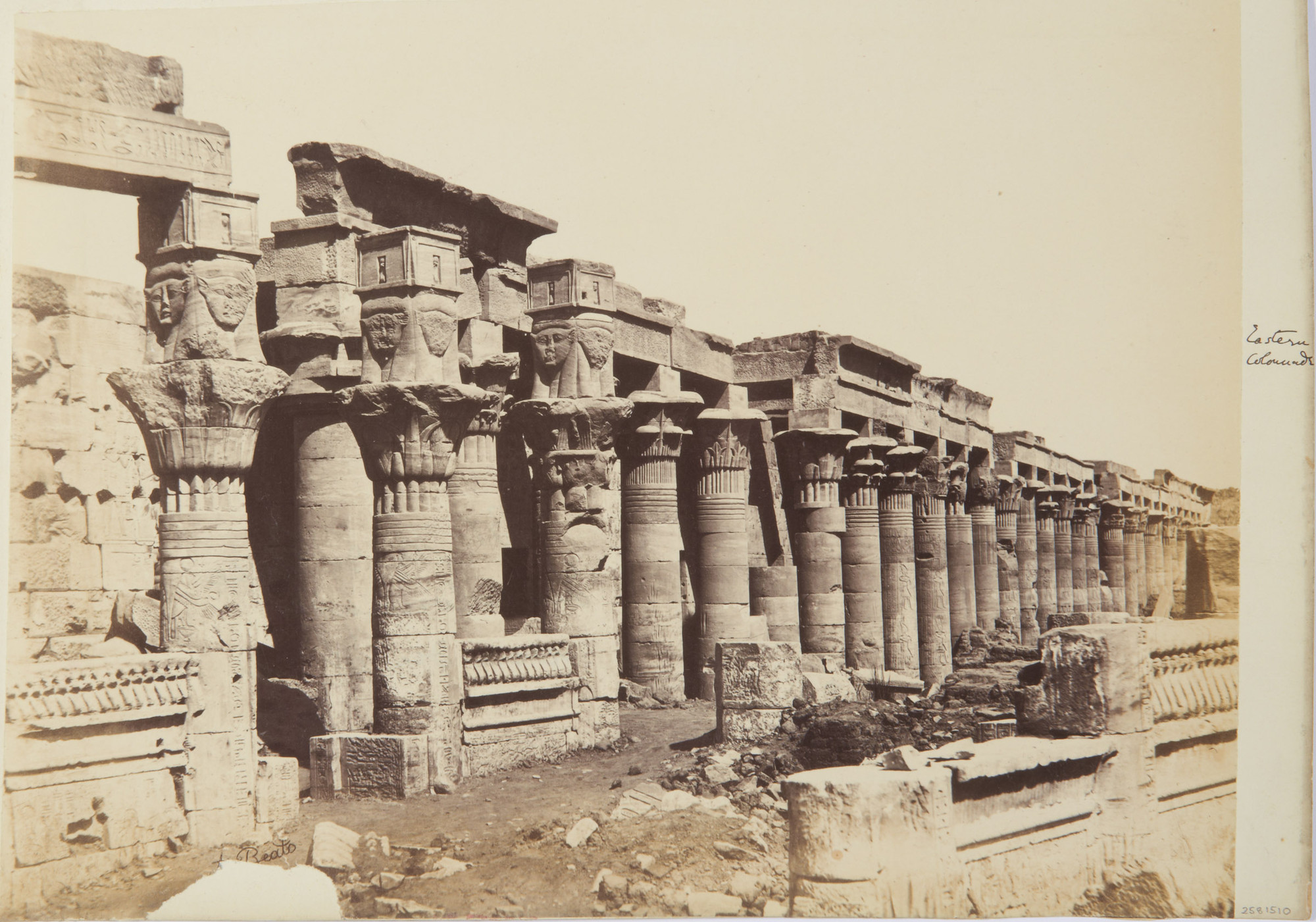Photograph of the Temple at Philae: columns with hieroglyphics, flower shaped capitals three-quarters of the way up column, with faces carved on final quarter; some columns linked by lintels and architrave