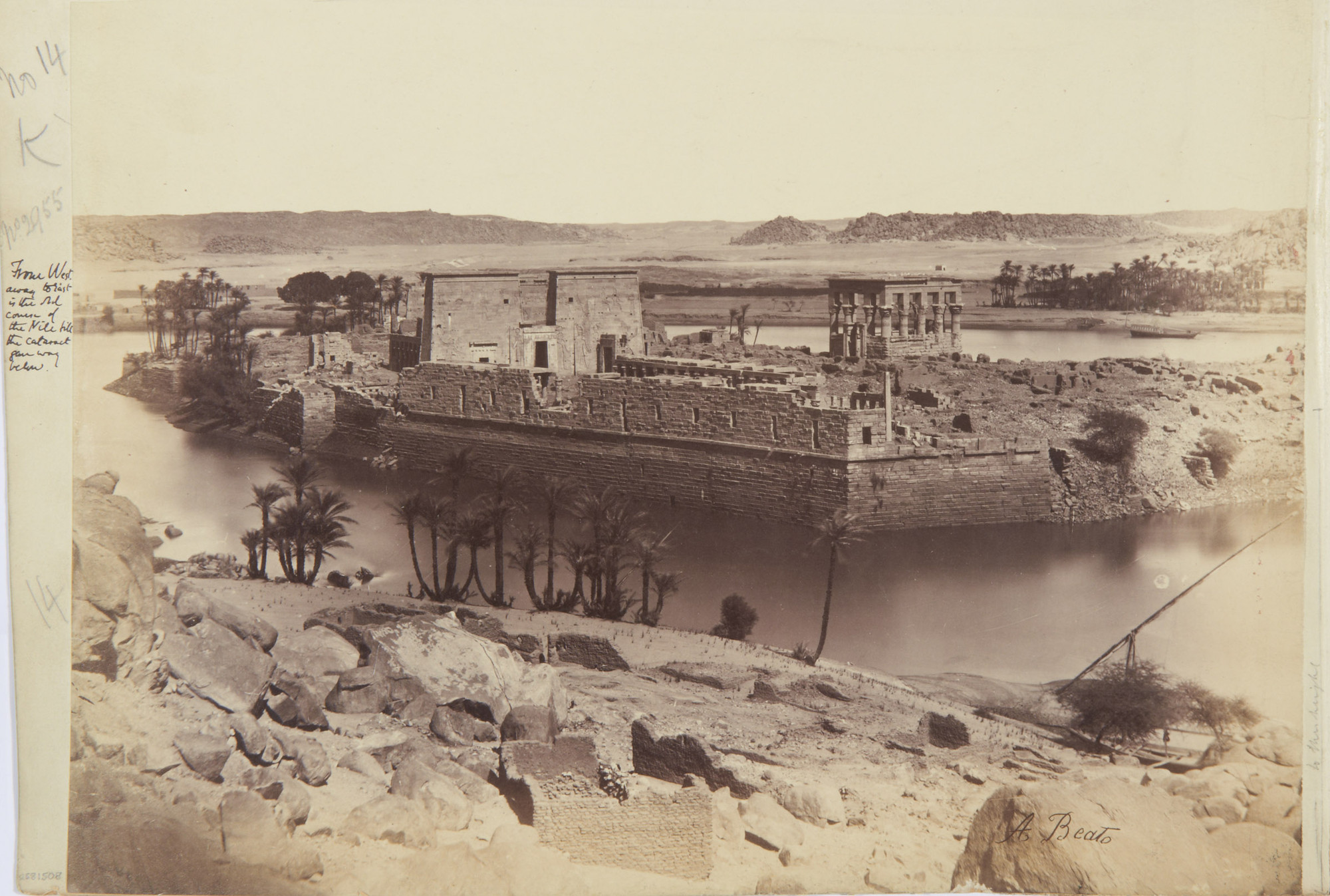 Photograph of view from hill strewn with rocks over to ruins of temple of Philae on its island; pylons, walls and 'Pharoah's Bed'.