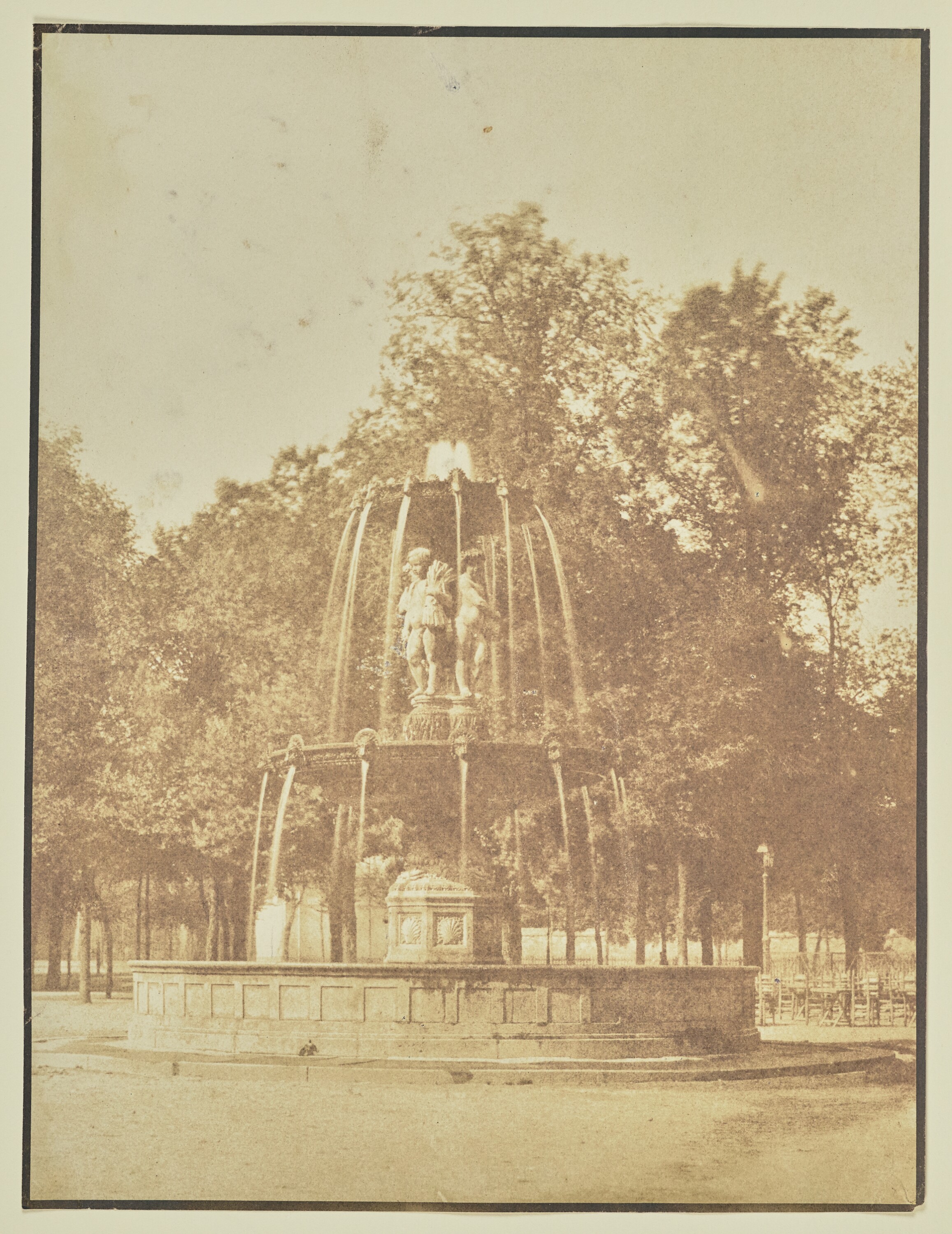A fountain with a large round basin and two tiers. Sculptures of nude figures are supporting the top tier. Water is pouring into the lower basins from narrow, distinct streams.