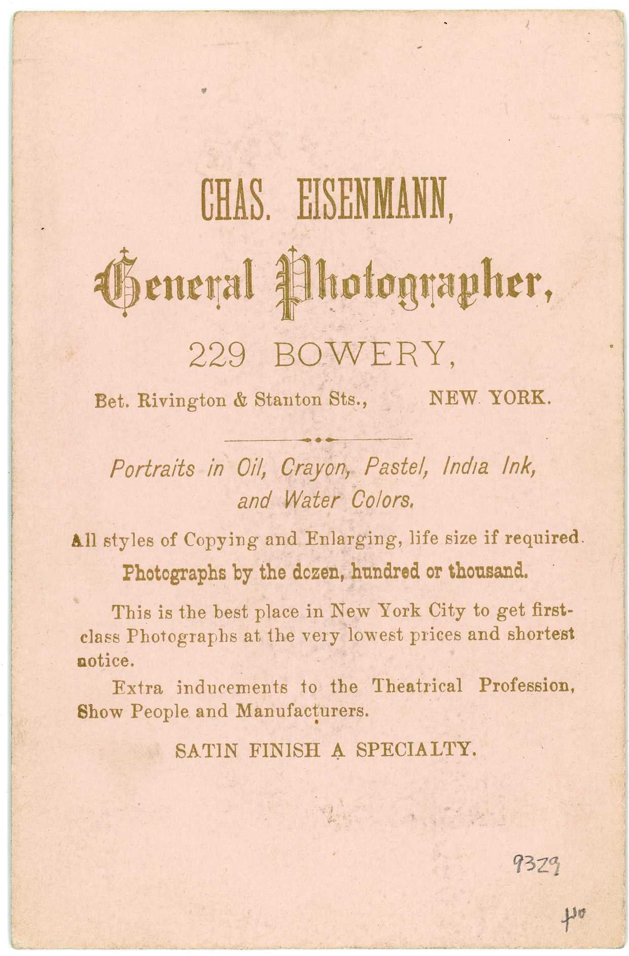 Backmark for "Chas. Eisenmann, General Photographer, 229 Bowery, Bet. Rivington & Stanton Sts., New York."