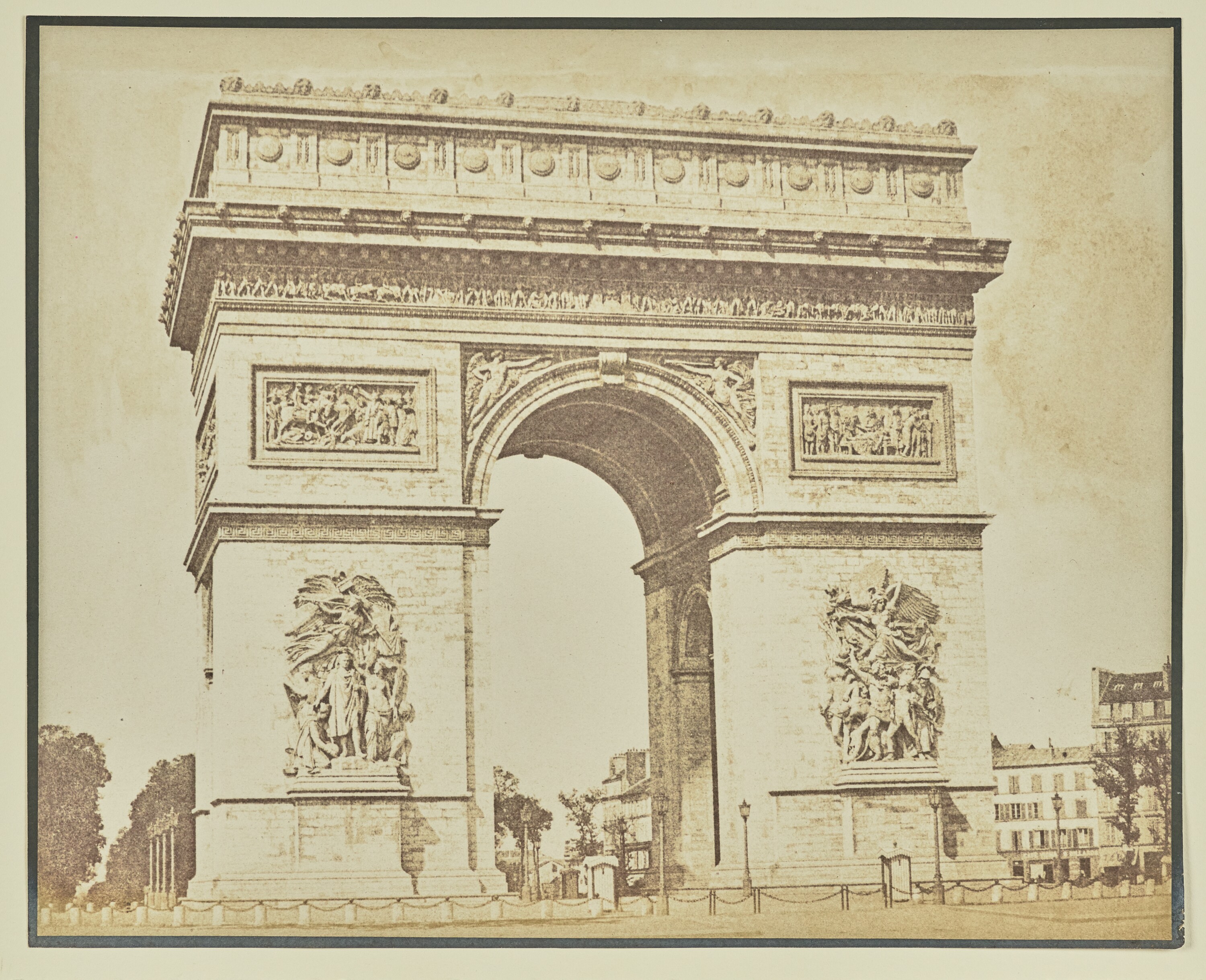 A triumphal arch adorned with two sculptural groups, one on each pillar. Bas-reliefs decorate the tops of the pillars and around the archway.