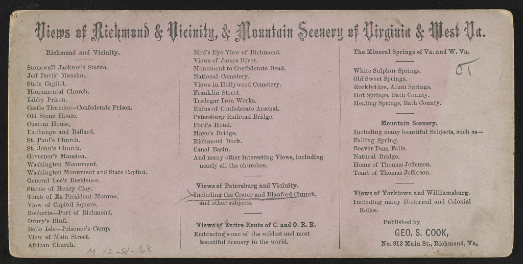 George S. Cook 1880-1890 Backlist for "Views of Richmond & Vicinity, & Mountain Scenery of Virginia & West Va."