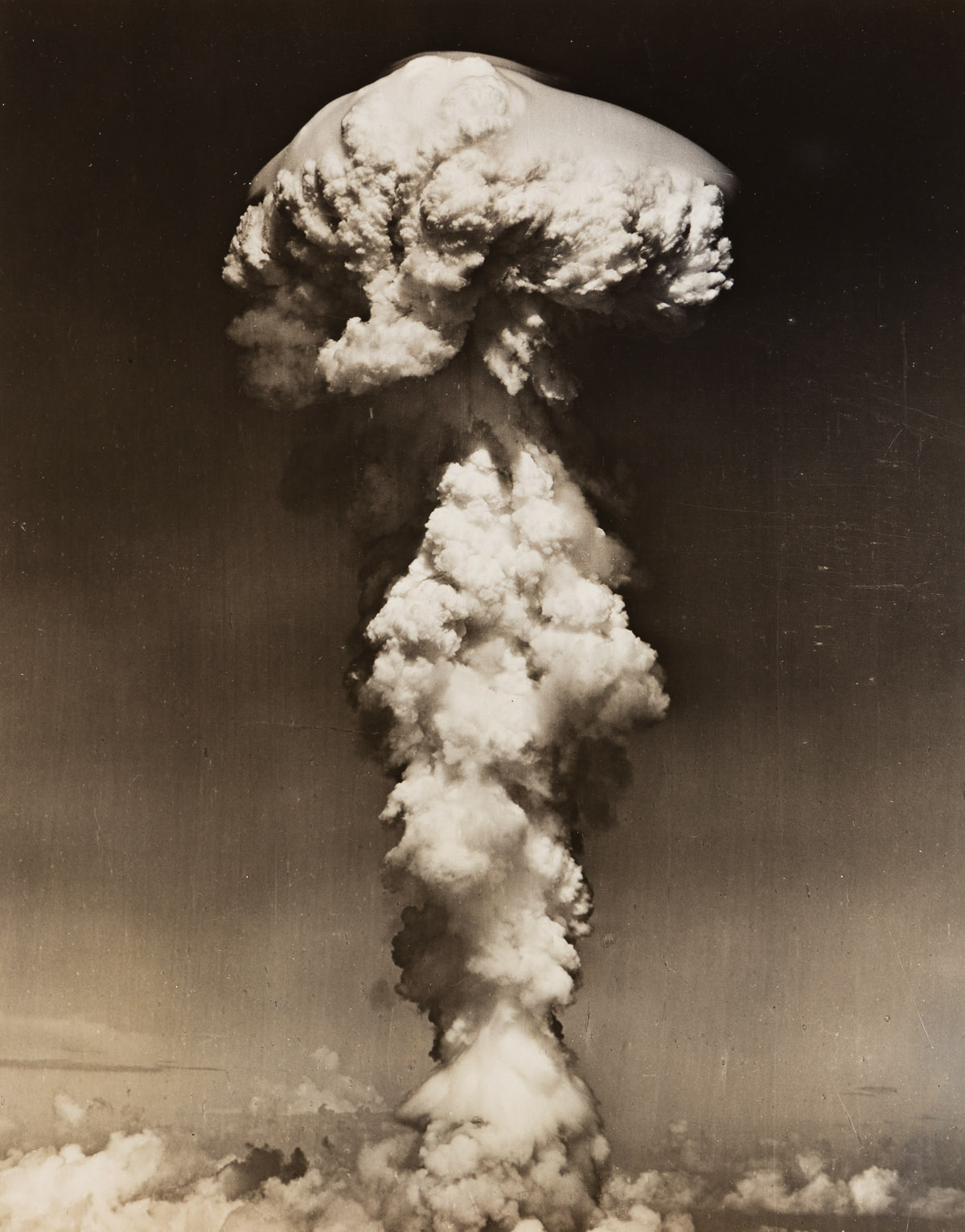 In January 1946, a U.S. nuclear weapon mission dubbed Operation Crossroads began testing atomic bombs on the remote lagoon of Bikini Atoll. Automatic cameras were mounted in towers on the lagoon and Crossroad pilots flew photo specific planes at a safe distance to capture the detonation stages of two atomic explosions, the Baker Day and Able Day blasts. The photographs in this collection showcase aerial views and stationary ground level shots of both blasts at various stages. Silver prints, the images measuring approximately 7x9 inches (17.8x22.9 cm.), the sheets 8x10 inches (20.3x25.4 cm.), and the reverse, most with a numeric hand stamp, on verso, and most accompanied by a typewritten caption. 1946