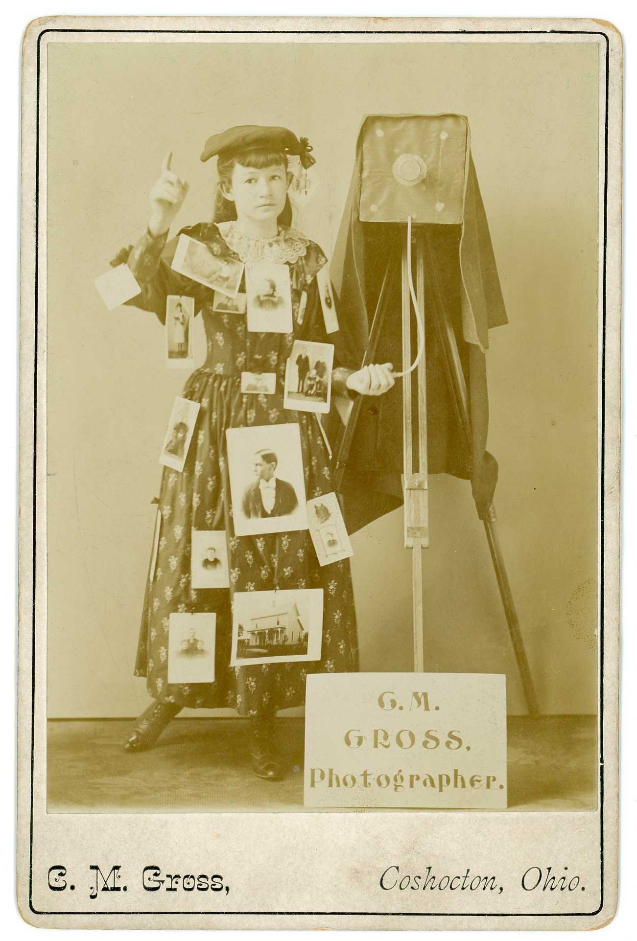 Studio portrait of a banner girl dressed with photographs and next to a camera with a bulb shutter release in her hand