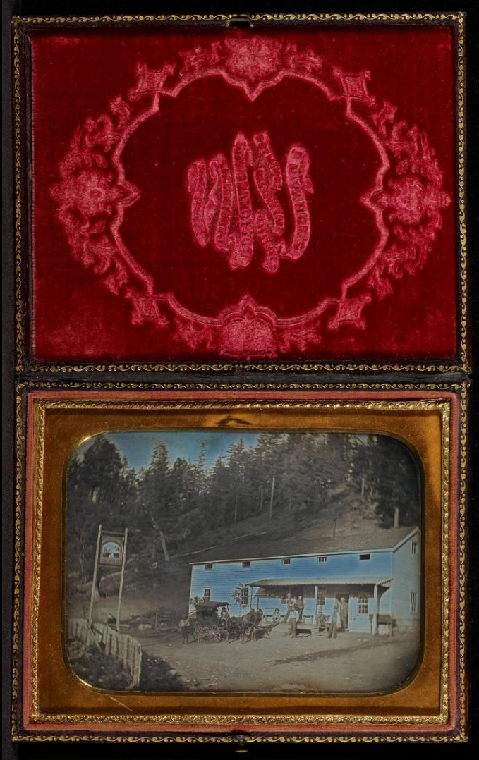 Sign on stilts at right; group of men on porch of building; riders in horse-drawn wagon in front of building.