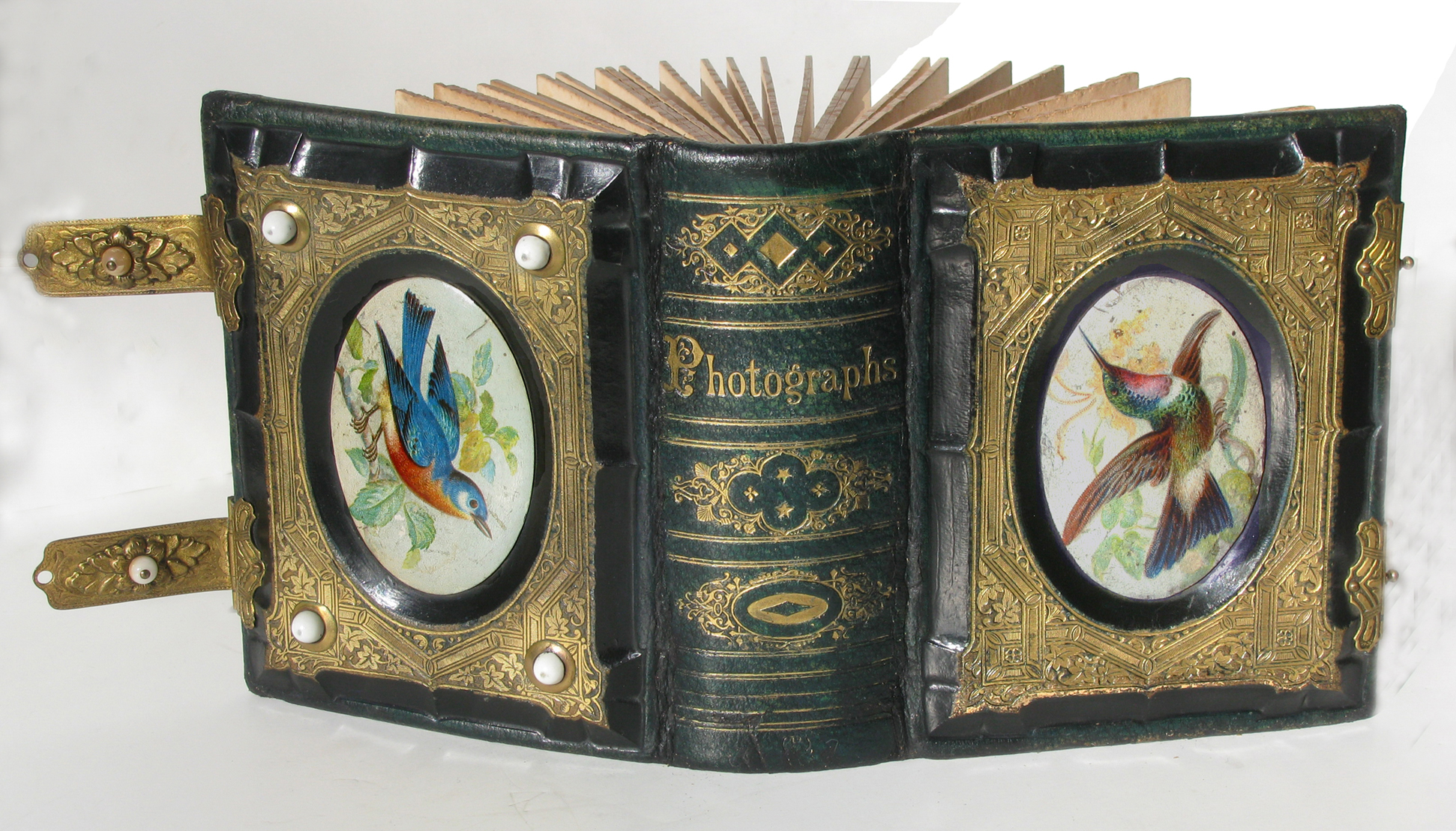 Private collection of Pam FerrazzuttiThe raised leather covers are embossed, profusely gilded and feature colorful convex lithographs of a hummingbird & bluebird.