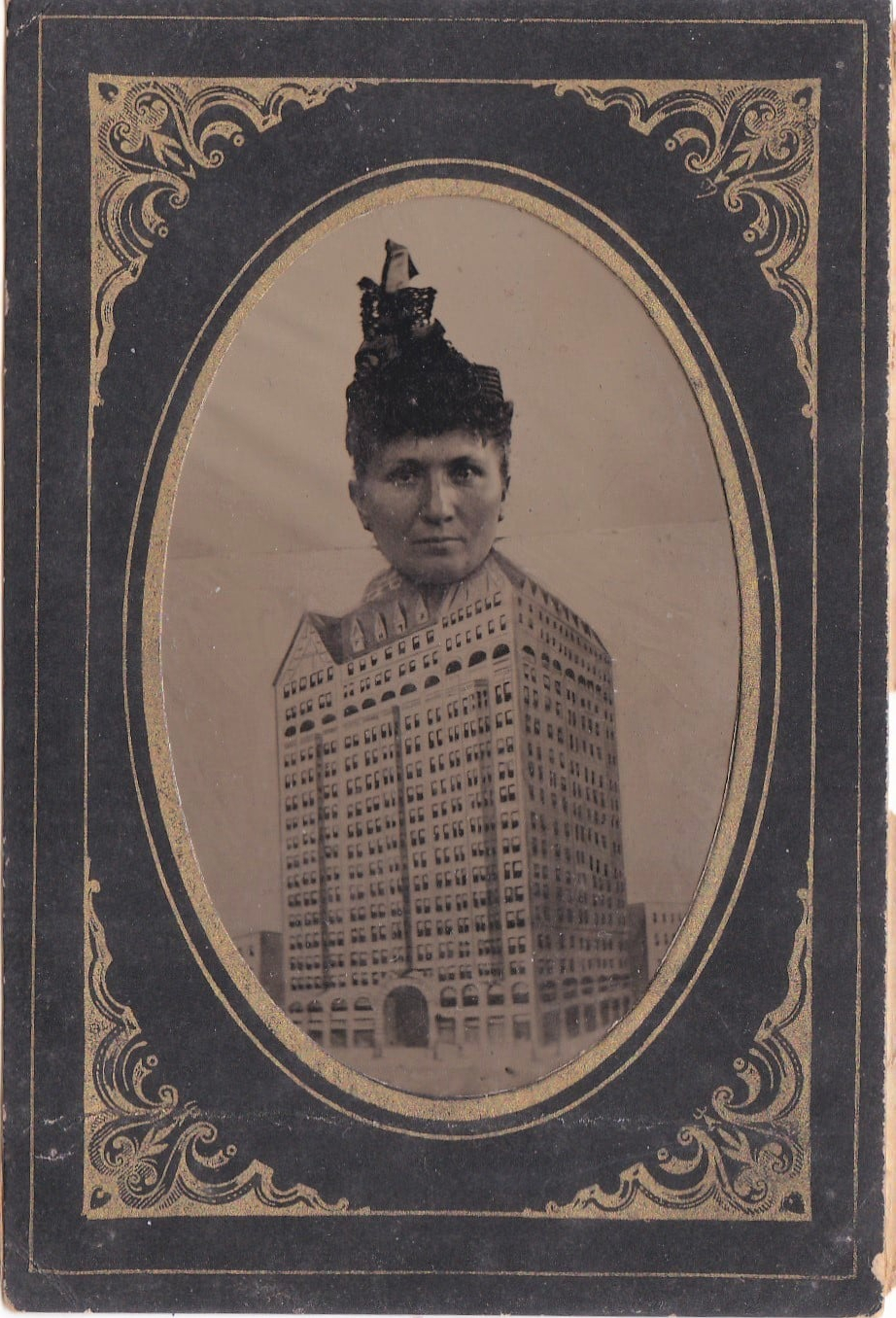A woman looming over a foreground of the Chicago Masonic Temple Building