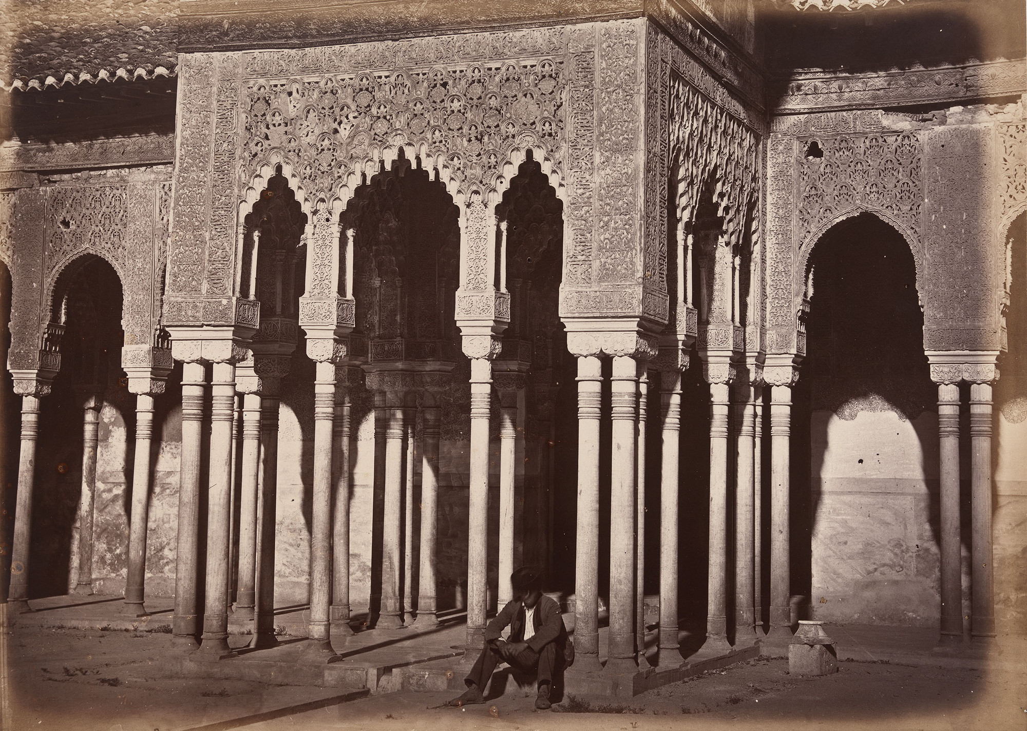Photograph of a portico in the Court of Lions at the Alhambra, Granada. The portico arches are supported on narrow pillars with intricately carved stone capitals that support arches. Above the arches is filigree stonework. A man is seated on the ground in the foreground.