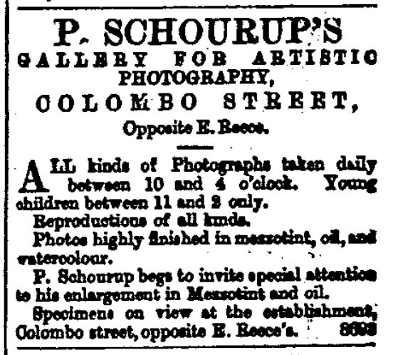 P. Schourup 1876, 15 November Advert for "P. Schourup's Gallery for Artistic Photography, Colombo Street, Opposite E. Reece."