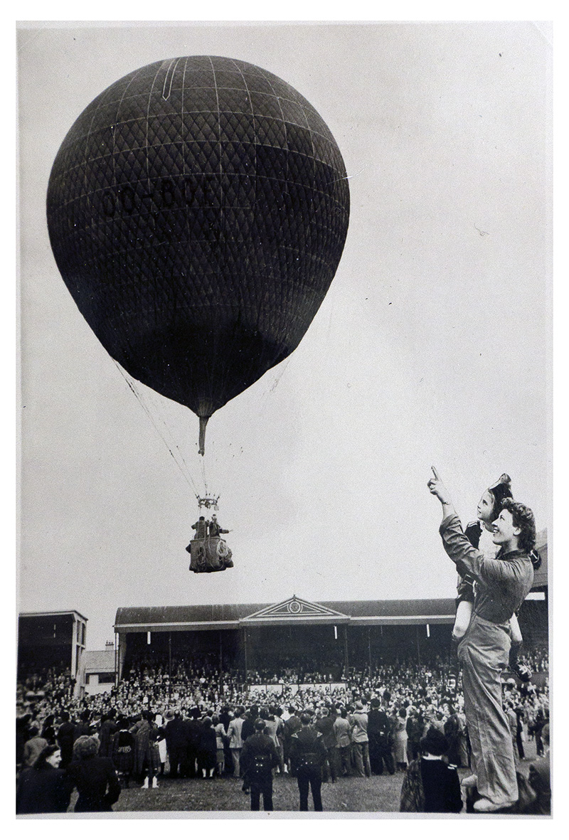 A woman carrying a child points to a rising balloon (German)