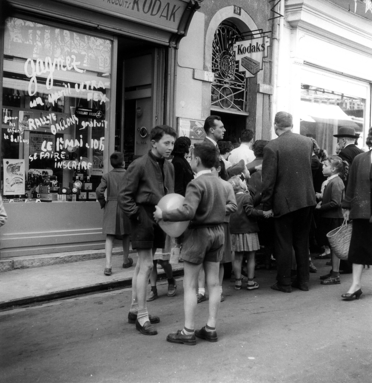 Exterior of the photography shop of Léon Bouzerand during a balloon rally, Cahors, France