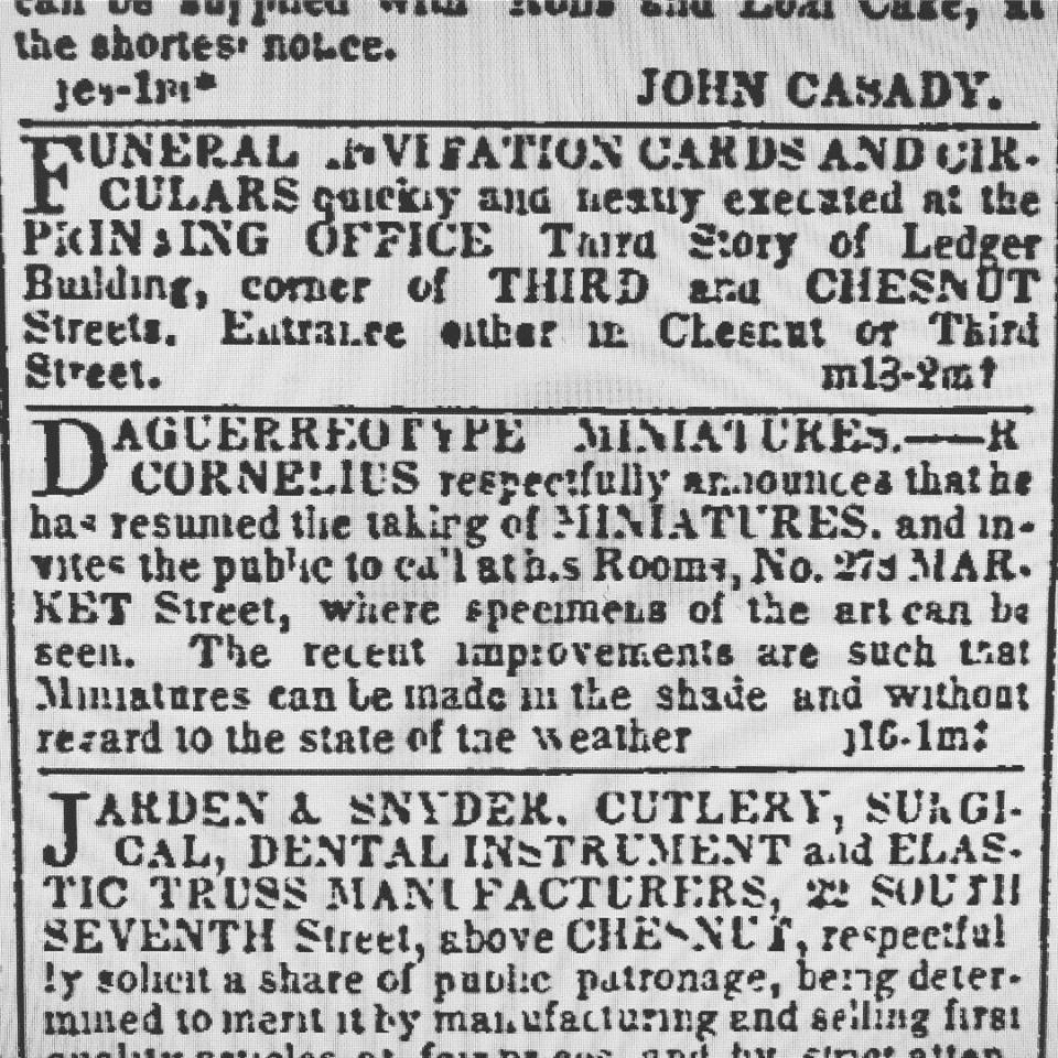DAGUERREOTYPE MINIATURES. - R CORNELIUS respectfully announces that he has resumed the taking of MINIATURES, and invites the public to call at his Rooms, No. 278 MARKET Street, where specimens of the art can be seen. The recent improvements are such that Miniatures can be made in the shade and without regard to the state of the weather."