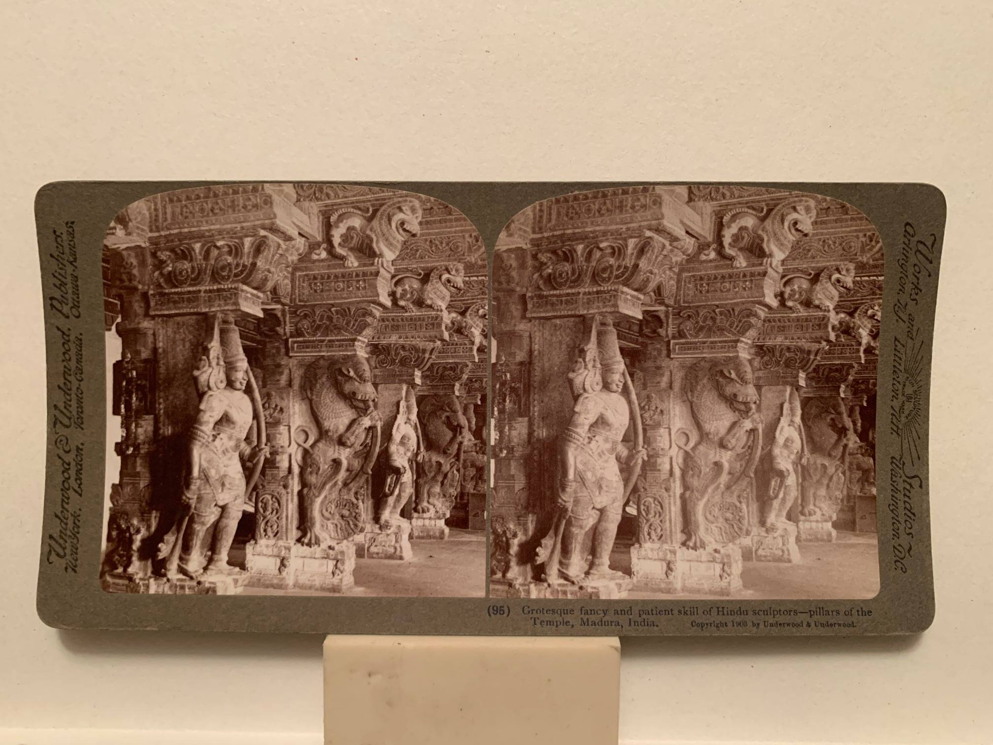 Grotesque fancy and patient skill of Hindu sculptors - pillars of the Temple, Madura, India.