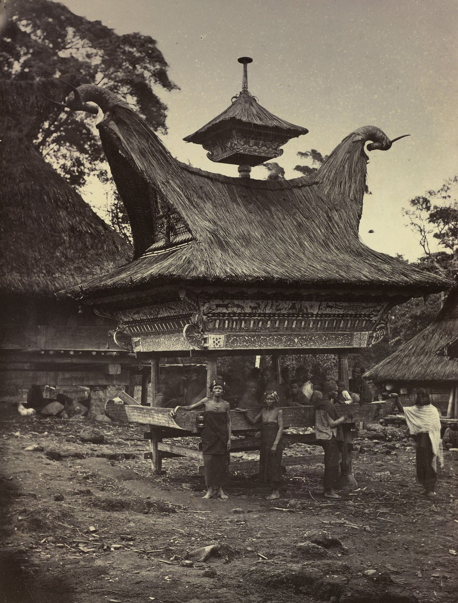 Photograph of a Batak tomb in a Batak village, North Sumatra. The tomb has an elaborate thatch roof and its structure is supported off the ground with wooden stilts. The exterior is decorated with painted and carved patterns and depictions of animals and people. A group of Batak villagers are seated inside the tomb. Four villagers stand outside the tomb, three of which face the camera. In the background are wooden buildings with thatched roofs.