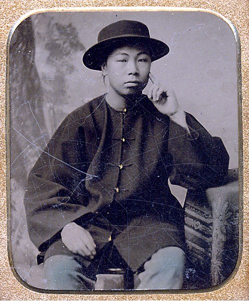 nteresting pose: he holds his finger to his cheek. This is taken in a studio with a landscape backdrop. Possibly he's a merchant [California?] His trousers are lightly tinted. 1/6 plate American TINTYPE in half case.