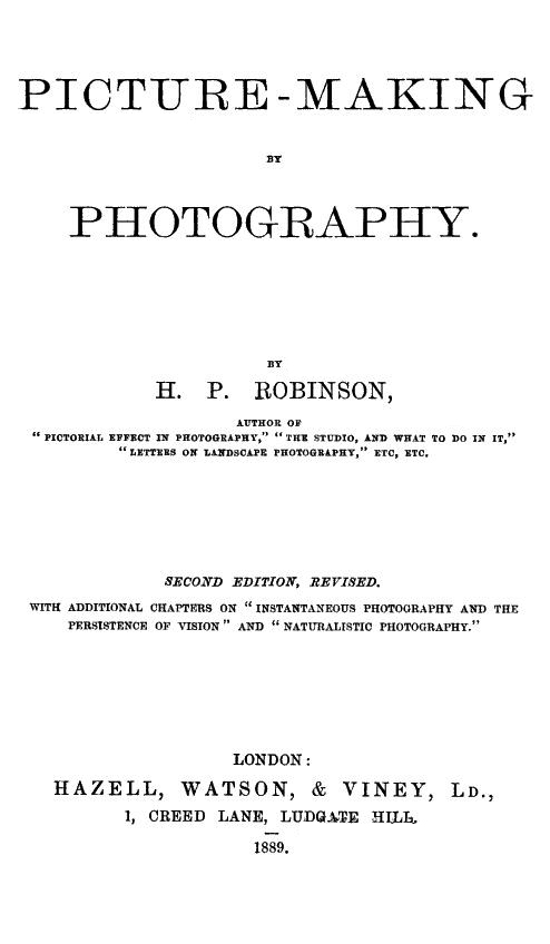 Title page of H.P. Robinson "Picture-Making by Photography", Second edition, revised (London: Hazell, Watson & Viney, Ld., 1889)