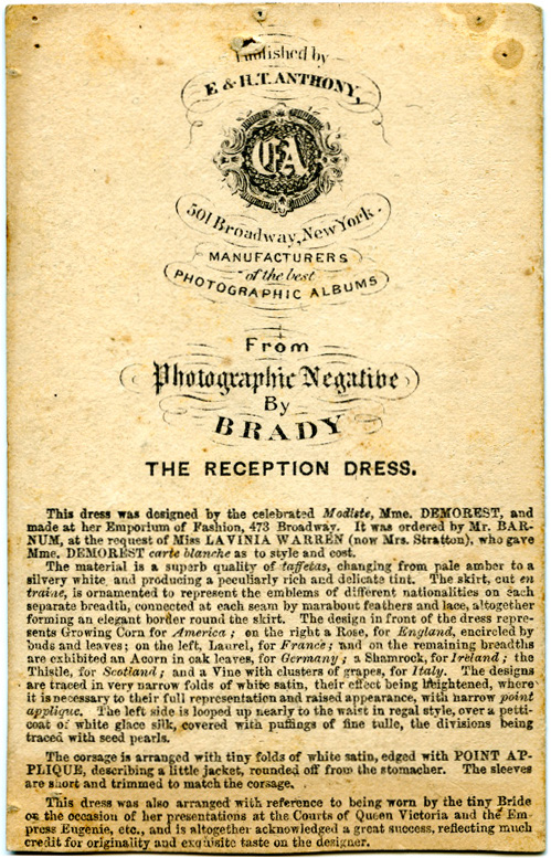 modiste, Mme. DEMOREST, and made at her Emporium of Fashion, 473 Broadway. It was ordered by Mr. BARNUM, at the request of Miss LAVINIA WARREN (now Mrs. Stratton), who gave Mme. Demorest