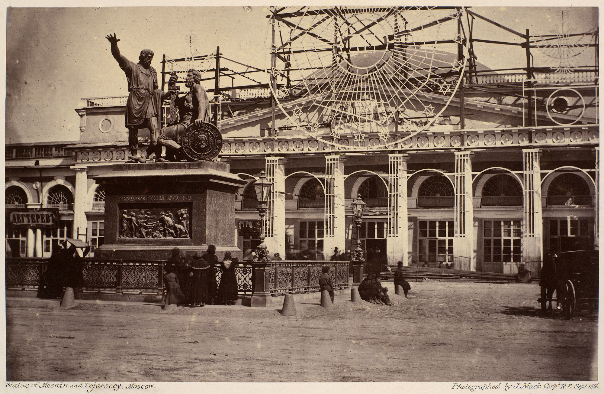 Photograph of the Monument to Minin and Pozharsky in Moscow. The monument has a large granite base with a plaque depicting citizens giving away their possessions. Above are two large sculptures of Minin and Pozharsky. The figure to the left is raising his right arm in the air, and the figure to the right is sitting with an ornate sword in one hand and a shield in the other. The statue is surrounded by a low fence, with several small groups of people standing around it. Behind is a building partly obscured by the frame of a large illumination. The monument commemorates Prince Dmitry Pozharsky and Kuzma Minin, who raised a Russian army to defeat Polish-Lithuanian Commonwealth forces in 1612. This is one of a series of photographs taken by Corporal J Mack during the coronation celebrations of Alexander II, Emperor of Russia. He was part of a group of British representatives led by Lord Granville.