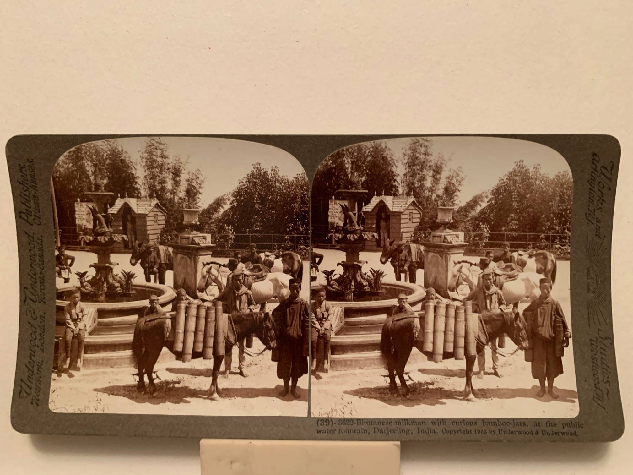 Bhutanese milkman with curious bamboo-jars, at the public water fountain, Darjeeling, India.