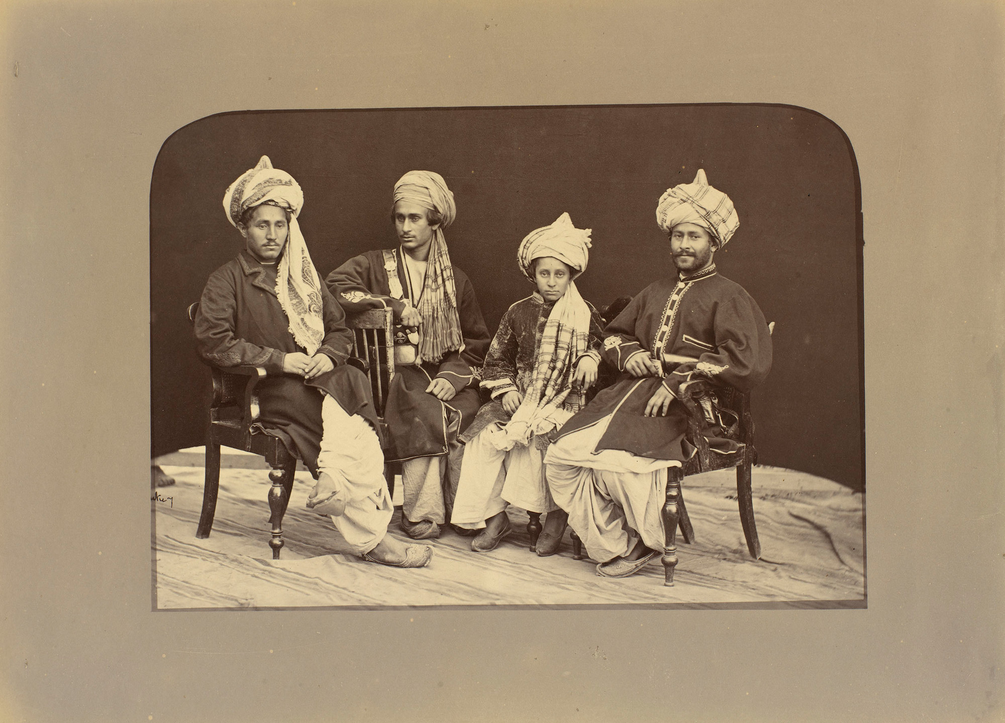 Photograph of four sons of Nowroz Khan, the leader of the Lalpura region of Afghanistan. They are sitting in a row on wooden chairs with the youngest of the four second from the right. They are wearing traditional Afghan clothes including headscarves and pointed shoes. The photographer John Burke travelled with the Peshawar Valley Field Force during the Second Anglo-Afghan War (1878-80), one of a series of conflicts between Britain and Russia over control of Afghanistan. In addition to photographing landscapes and key strategic sites he captured prominent Afghan families and military personnel.