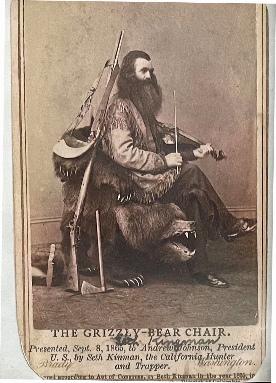 The Grizzly-Bear Chair. Presented, Sept. 8, 1865, to Andrew Johnson, President U.S., by Seth Kinman, the California Hunter and Trapper.