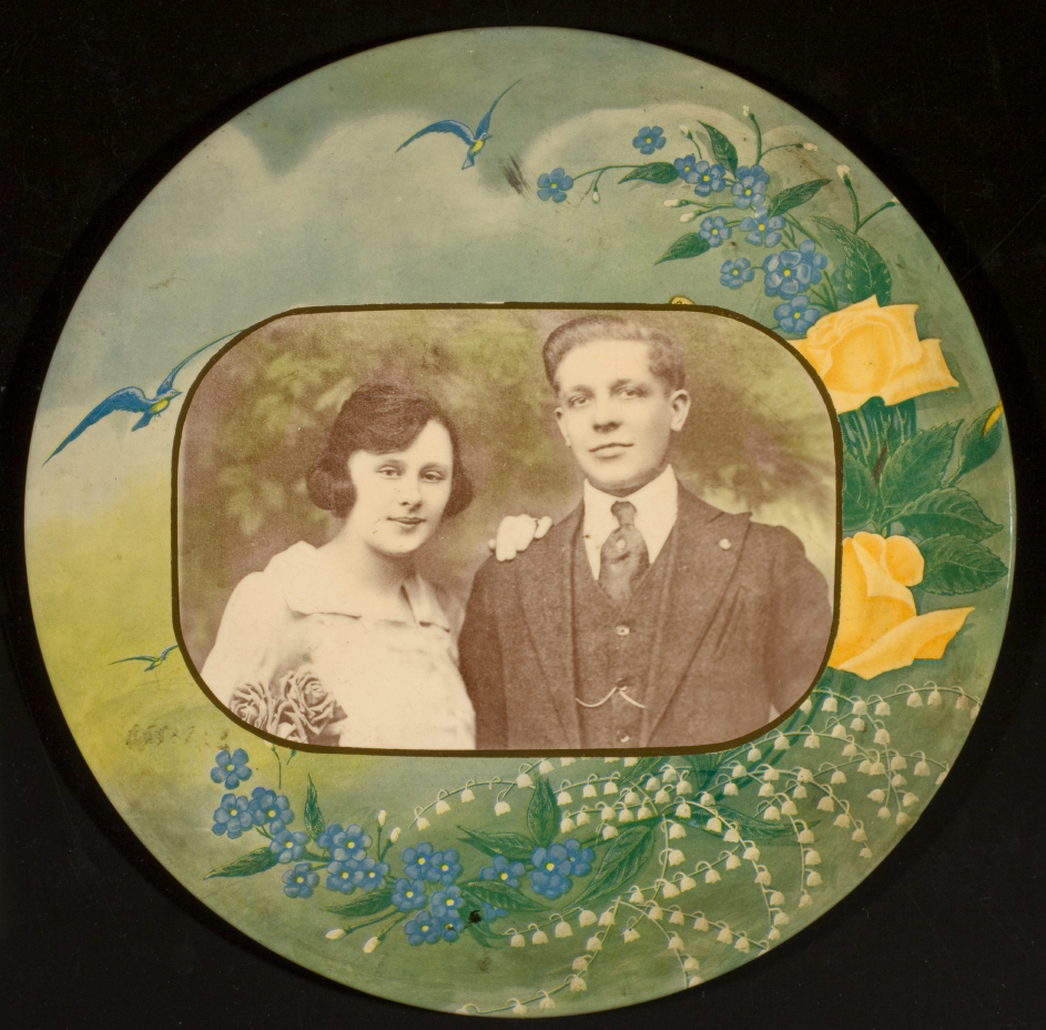 [Portrait of a man and a woman on a photographic button]