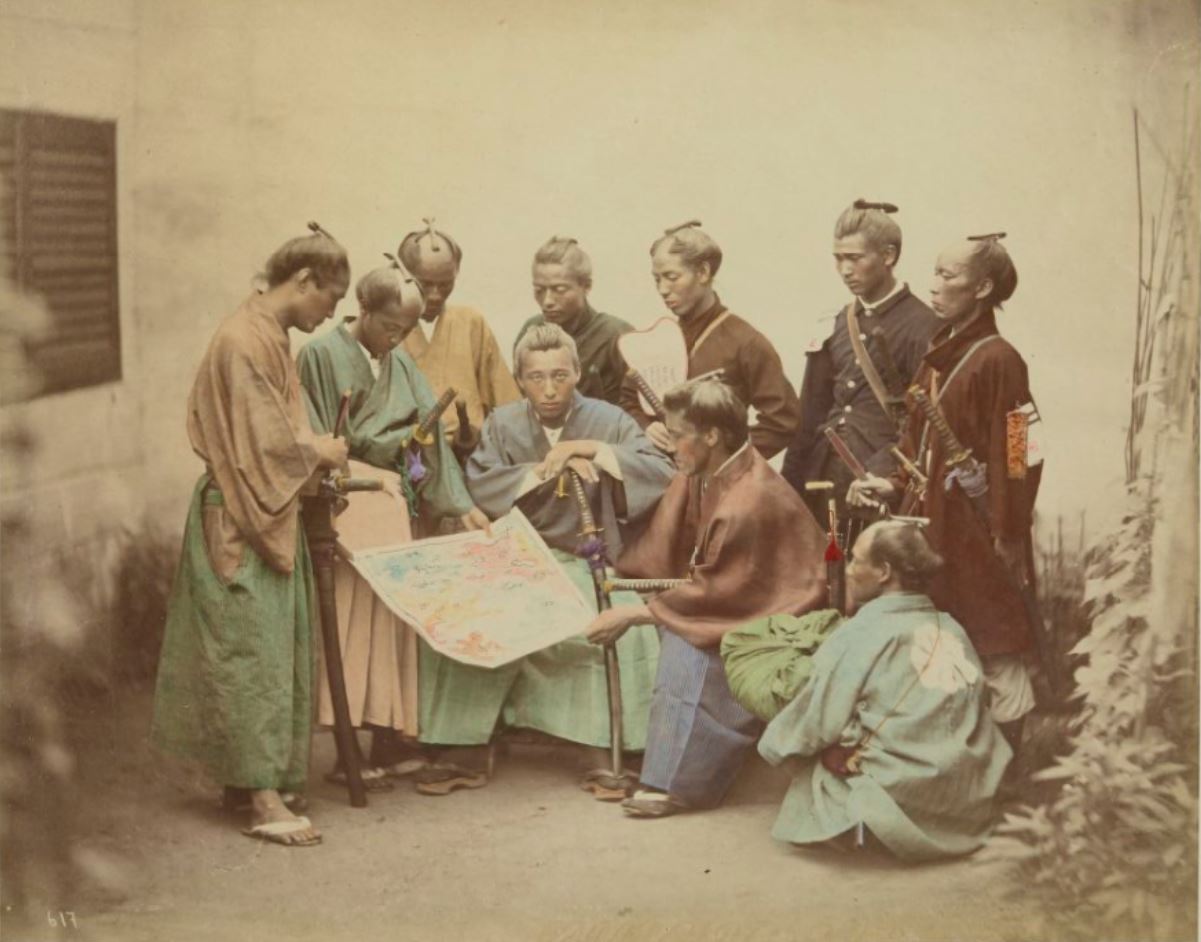 [Groupe de samouraïs du domaine de Satsuma regardant une carte]