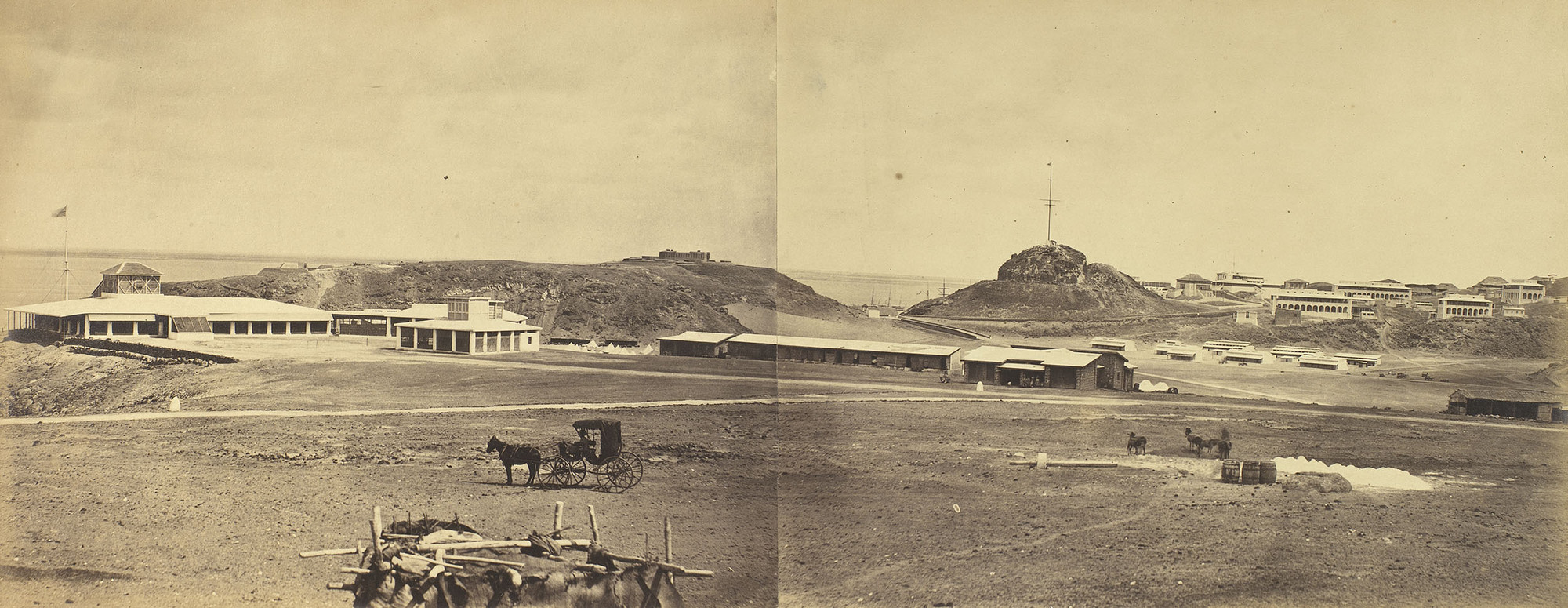 Two photographs mounted together to create wide-angle view. Flagstaff Hill on right, several buildings in middle distance, tents of the European regiment. Sea in distance. A horse and small carriage in left foreground. Wooden rack of skins drying in the sun.