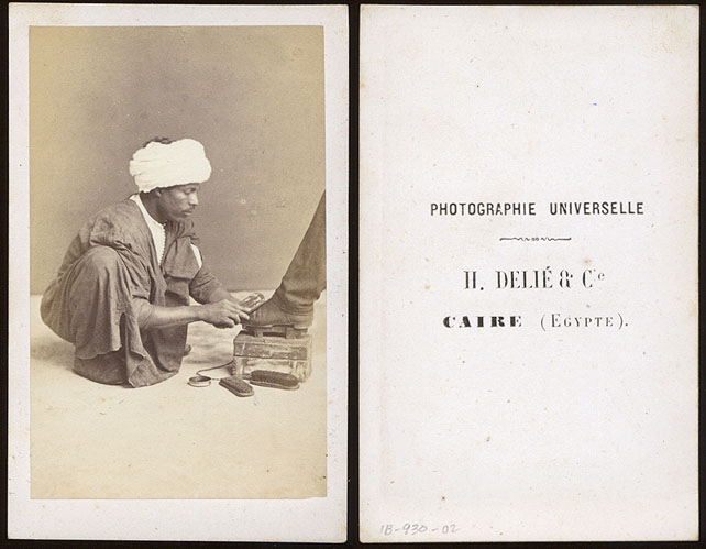 An Arab shoe-shine man shining a shoe, by Hippolyte Delié, circa 1865. Imprinted front "H. Delié & Cie. Phot." and on reverse "Photographie Universelle / H. Delié & Cie. Caire (Egypte) ."