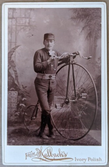 A studio portrait of a man with a penny farthing